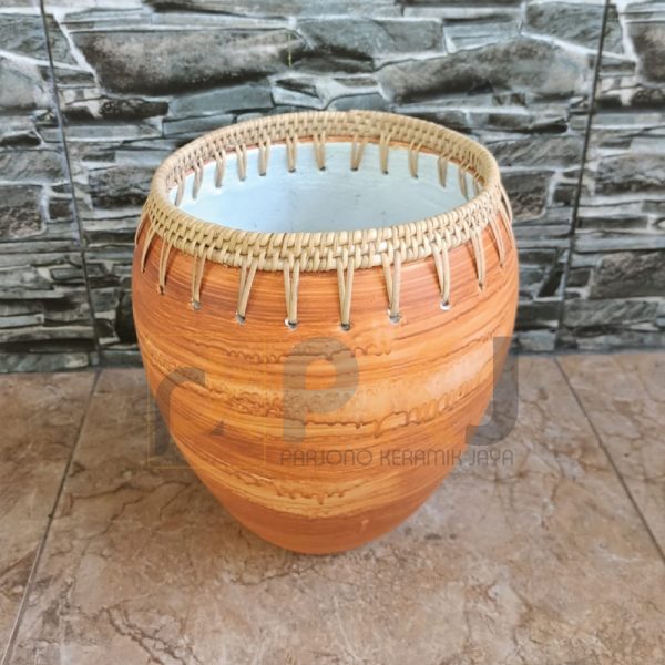 Guci dengan warna motif kayu dan pada bagian atas diberikan anyaman