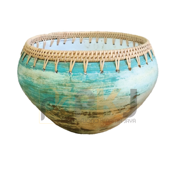 Guci berbahan tembikar dengan finishing anyaman rotan pada bibir guci. Sentuhan nuansa air yang semakin menjadikan guci nampak berkelas